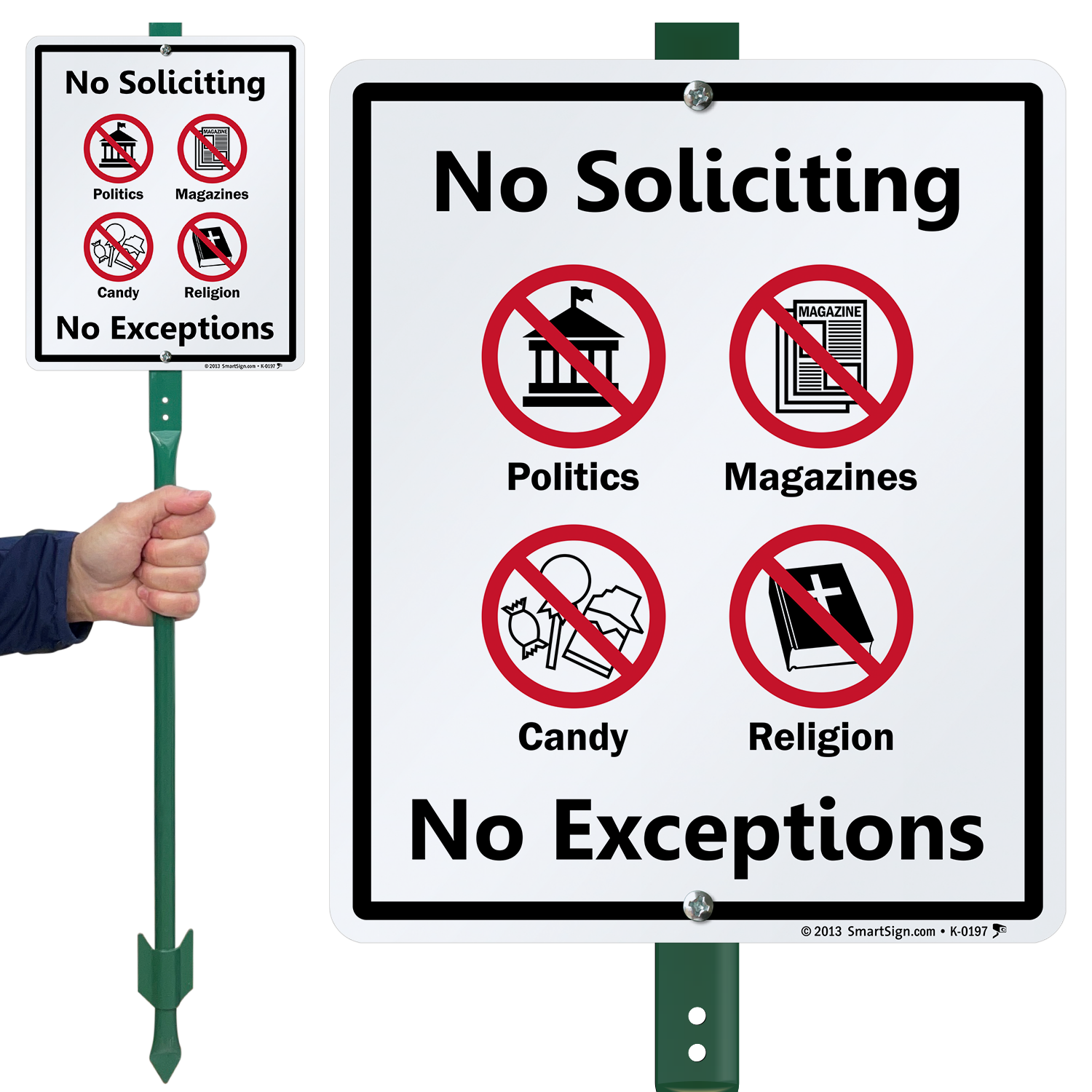 Leave no reasons for solicitors! This LawnBossâ„¢ Sign & Stake Kit clearly states that soliciting of any kind is prohibited, be it politics, magazines, candy, or religion related.